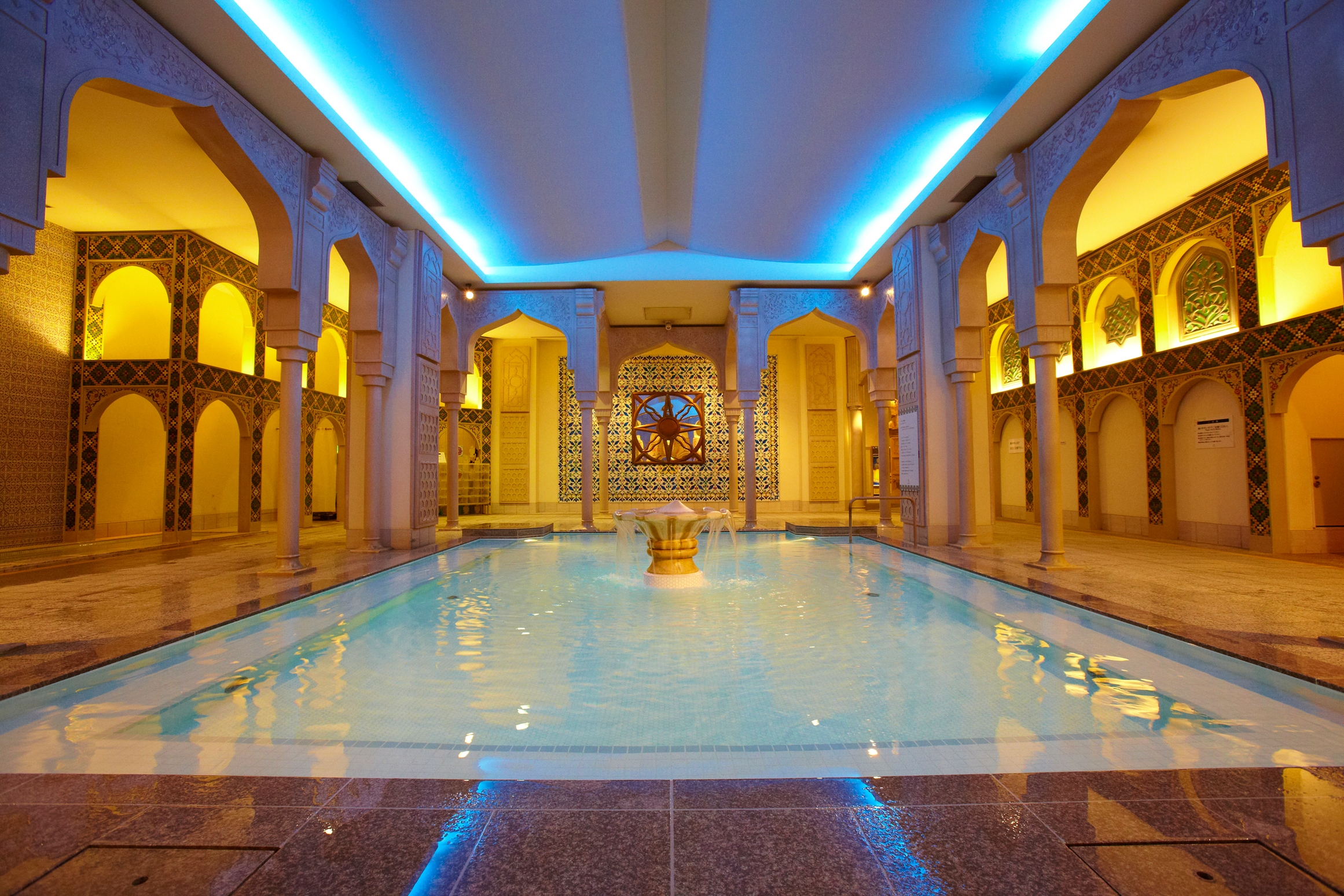 それぞれに6つ~7つの趣向を凝らしたお風呂があり、例えばアジアゾーンには日本の露天風呂はもちろんのこと、イスラムのお風呂、バリのお風呂、ペルシャのお風呂なんてのがあります。